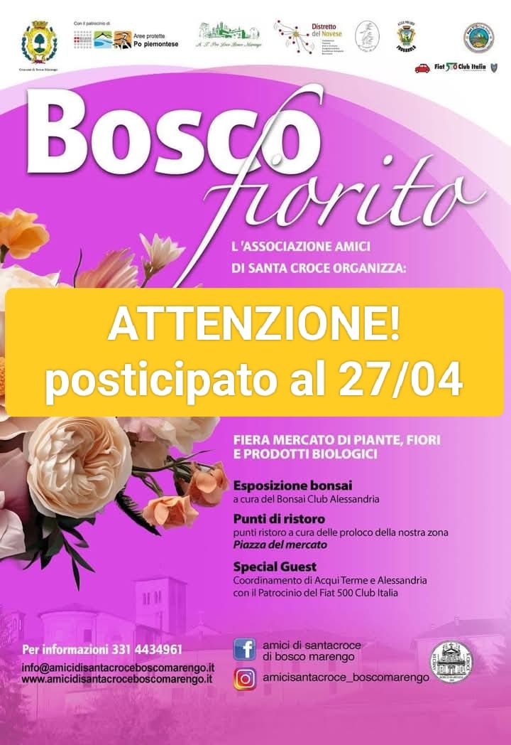 L'Associazione Amici di Santa Croce di Bosco Marengo, con il patrocinio del Comune di Bosco Marengo, organizza domenica 13 Aprile 2025 la XVa edizione della Mostra-Mercato di piante, fiori e prodotti da giardino denominata “Bosco Fiorito”.